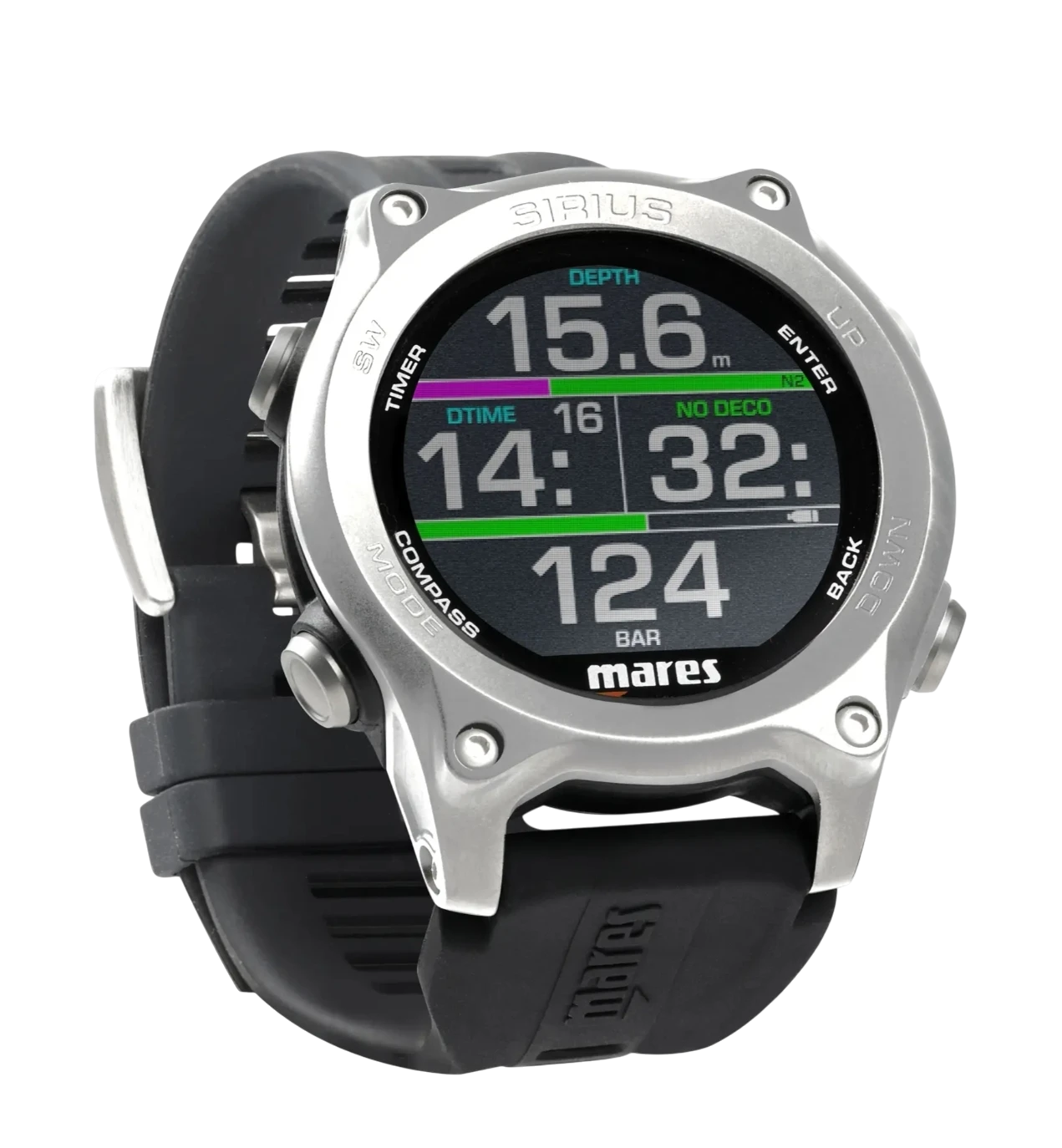 Il Sirius è un computer subacqueo a orologio che combina alla perfezione tecnologia ed eleganza. Le caratteristiche di questo computer subacqueo da polso sono al top della tecnologia sia per il subacqueo ricreativo che per quello Extended Range. Il subacqueo ricreativo può visualizzare in modo semplice ed intuitivo i dati dell'immersione, con la possibilità di integrare i dati della bombola tramite il trasmettitore opzionale. Il subacqueo Extended range può inserire 5 tipi di miscele nitrox e trimix. Grazie al cinturino intercambiabile può essere utilizzato con qualsiasi spessore di muta.